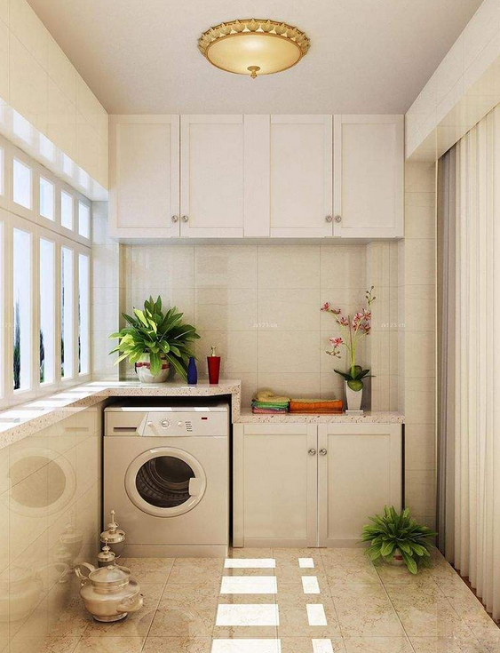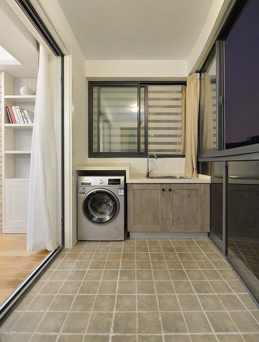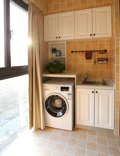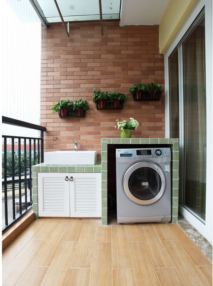 家庭卫生间太小,不方便洗衣服,不妨将阳台安装水池,摆放洗衣机,实用又方便。