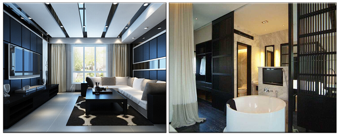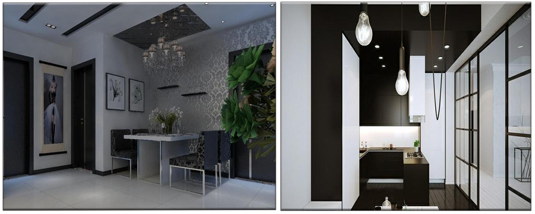 假如纯黑和纯白会形成很大的反差,对人的视觉也会有所损伤,所以在运用黑色停止家庭装修时,最好可以用淡黄色交融一下