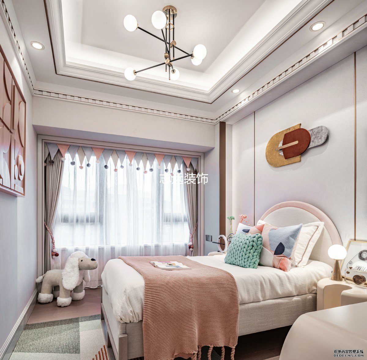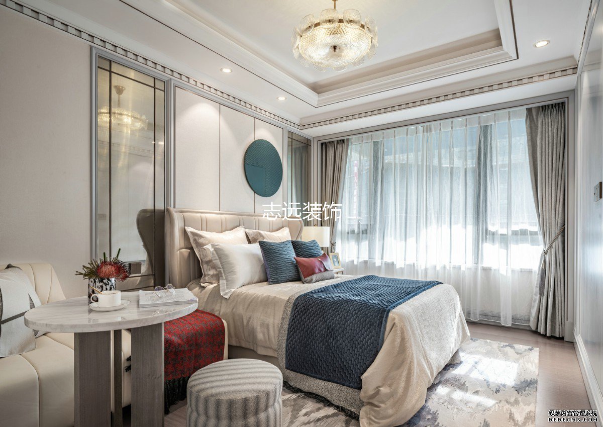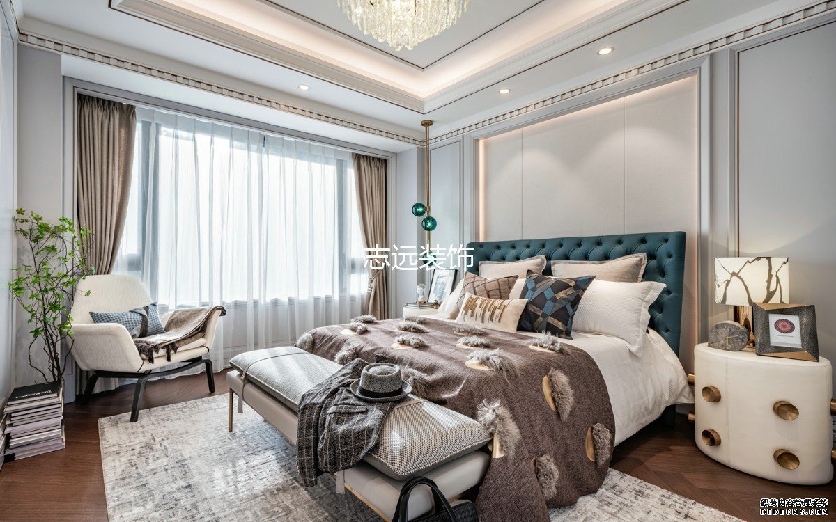 客户对于房子的风格上是比较有追求的,通过多次的沟通确定喜欢明亮的欧式风格,主卧融合艺术的家具,床品,配饰,在空间内表达对生活的的感受,触感自然舒适的床品,展露休憩空间应有的安逸。简洁而不随便,高级而不浮夸,缓缓躺下到舒适的梦乡,感受治愈的气息,是在都市中的理性状态回归到了内心柔和放松的力量。父母房采用白色为主色调,融合蓝色装饰,散发高雅卓越的低调气息。时尚稳重的家具以及暖色的灯光氛围点缀其中,如冬日暖阳又似暗夜星光,无声传递默默温情。儿童房的粉色代表甜甜的梦幻,白色代表单纯童趣,活泼中带有一丝宁静,产自土耳其不规则地毯,改变了空间原本单一的画面,充满童思遐想,将空间构成成孩童富饶无垠的精神世界一隅。
