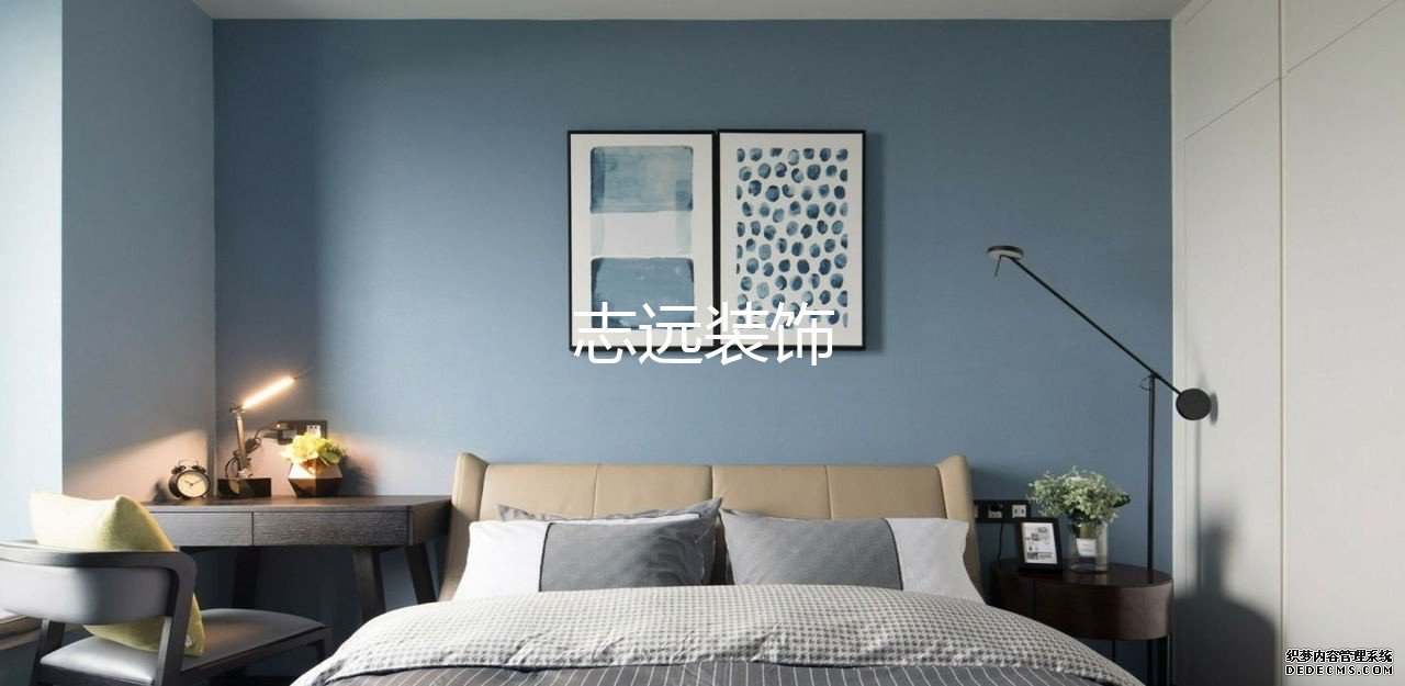 卧室的色彩设计受现代绘画流派思潮影响很大。通过强调原色之间的对比协调来追求一种具有普遍意义的永恒。装饰画、织物的选择对于整个色彩效果也起到点明主题的作用。